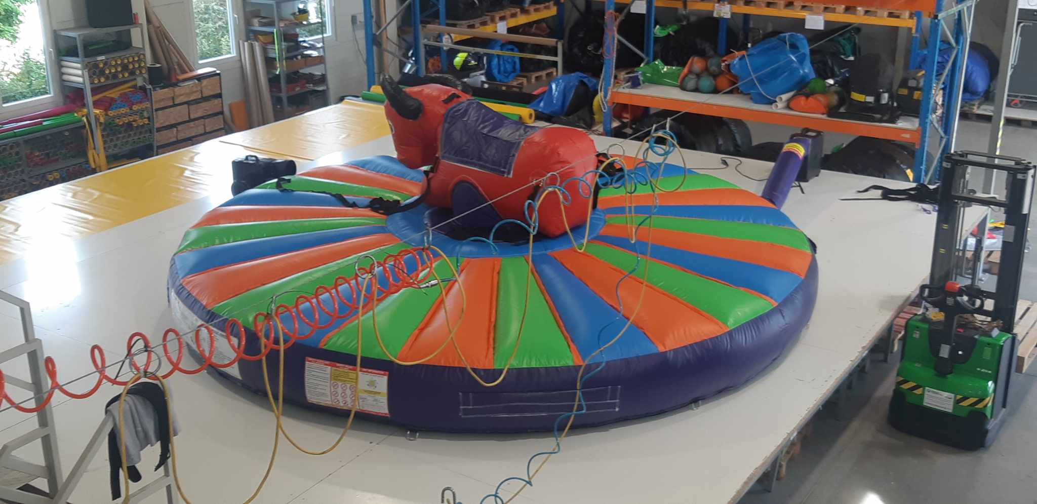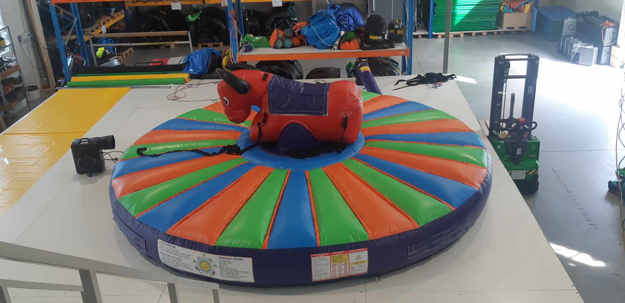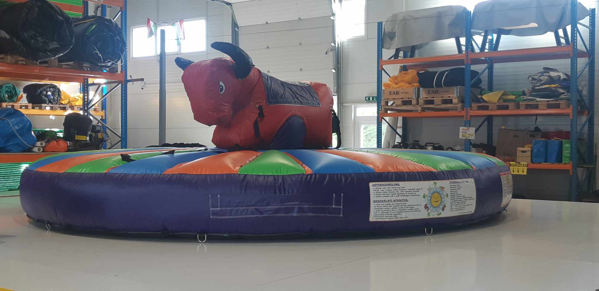 Ez a rodeó bika kifejezetten gyermekek számára készült, hogy ők is kipróbálhassák magukat a rodeók kemény világában! Ebben a játékban nincsenek mechanikus tartozékok, a bika is felfújt és emberi erő hatására mozgatható a húzóhevederek segítségével. Kül- és beltéren egyaránt felállítható! Felhasználók száma: 1 gyermek aki a bikán ül + 4 személy mozgatja a bikát. Felhasználói korlátozások: A balesetek elkerülése érdekében, valamint a játék megrongálódásának elkerülése végett az alábbi korlátozások betartása kötelező a rodeó bikán ülő gyermek számára: Minimális életkor: 5 év Maximális életkor: 10 év Minimális magasság: 120 cm Maximális magasság: 150 cm Maximális testsúly: 50 kg Működésének feltételei: 6x6 méteres sík terület, minimum 2,7 méter magas hely, valamint 230 V-os áram szükséges az 1,1kW-os befúvó motor működtetéséhez